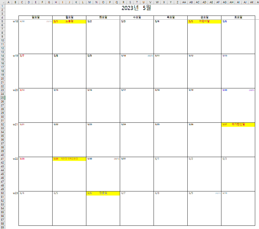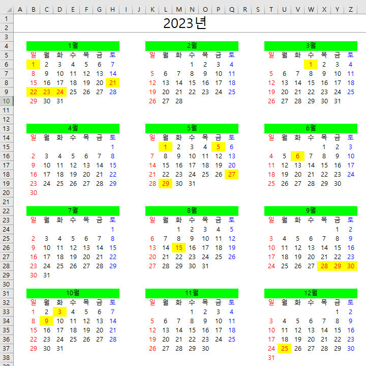 - 대한민국 공휴일을 노란색으로 표시합니다.