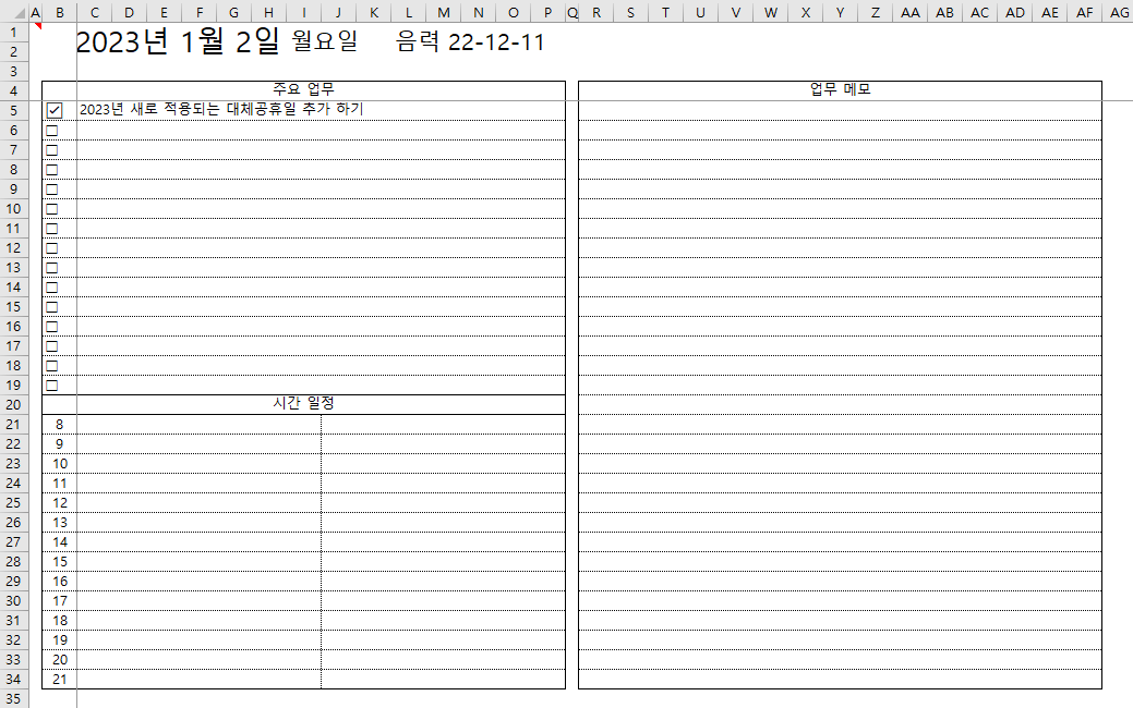- 오늘의 날짜, 요일, 음력, 공휴일을 표시하고, 주요할일, 시간일정, 업무 메모 양식을 표시합니다.