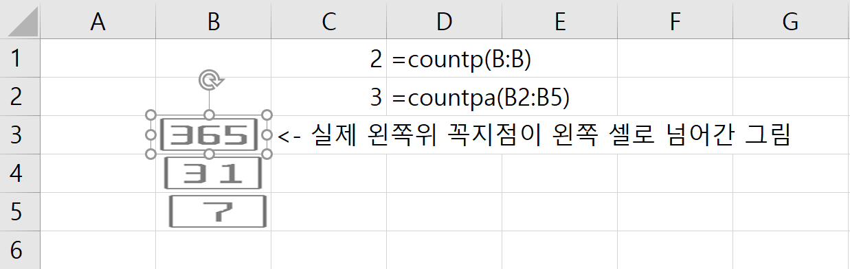 CountP( 범위 ) : 셀의 왼쪽위 꼭지점이 범위에 있으면 숫자를 셈