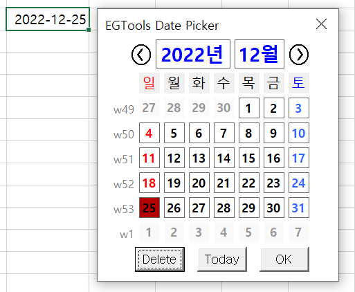 - 셀 서식이 있는 셀에 더블클릭하면 날짜 선택창