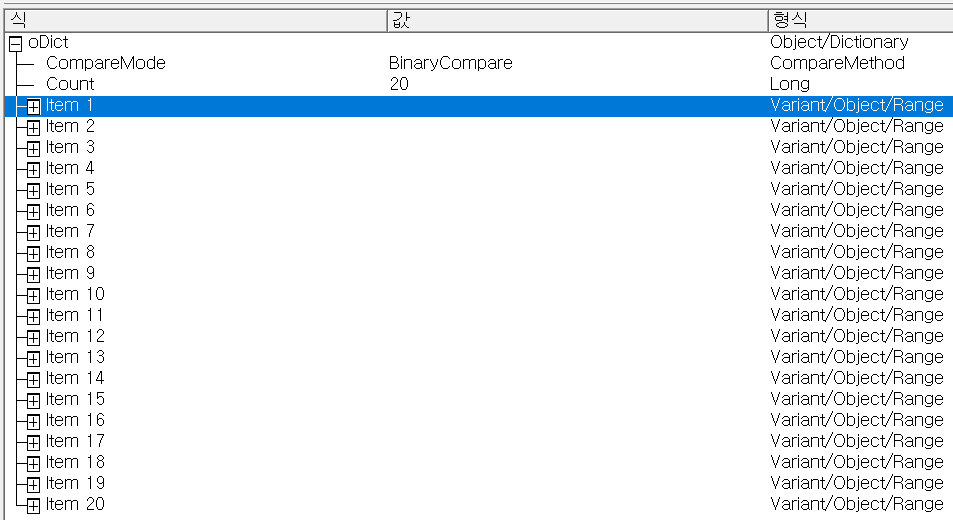 어라... Range Object 개체가 통으로 Dictionary의 Key로 등록이 되었네요...
