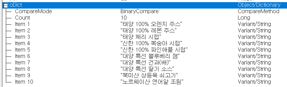 Dictionary를 개체 변수를 할당하여 Debug 해 봅니다.