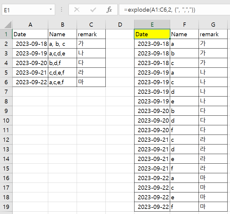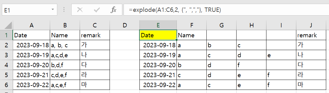 선택된 범위에서 다른 값은 그대로 유지하고 지정하는 열에 대해서 구분자를 기준으로 분해하여 나열합니다.