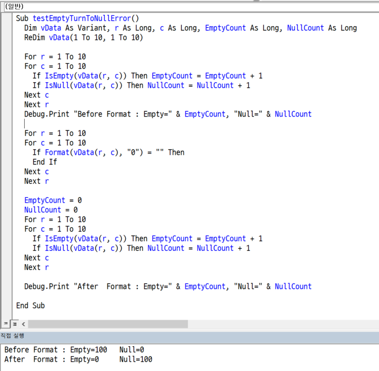 Debug.Print "After Format : Empty=" & EmptyCount, "Null=" & NullCount