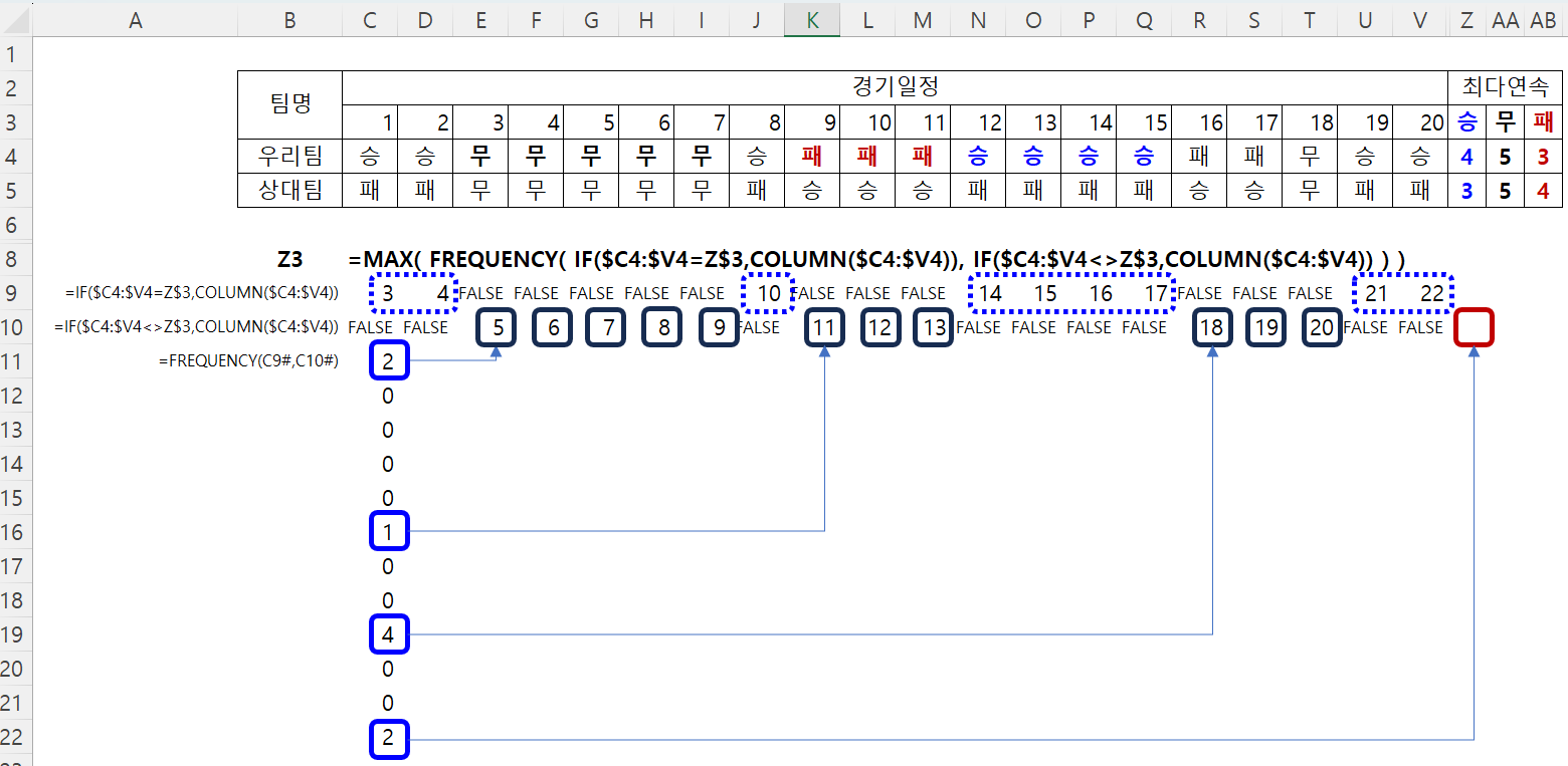 경기 결과가 C4:V4 범위에 기재되어 있을 때의 수식은 아래와 같습니다.