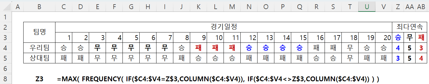 경기 결과 승무패를 계속 기재한 자료에서 연속으로 승리한 연승이나 연속으로 패배한 연패의 최대수를 계산하는 수식입니다.
