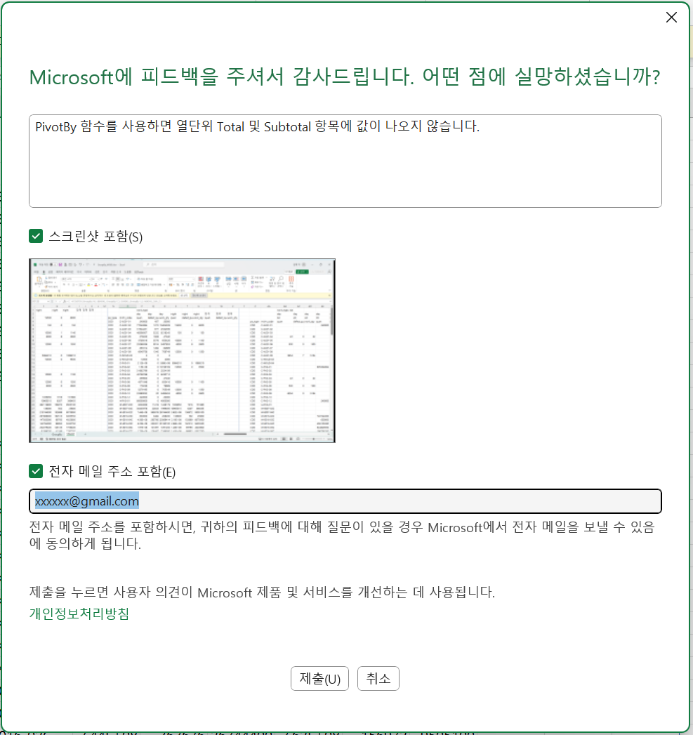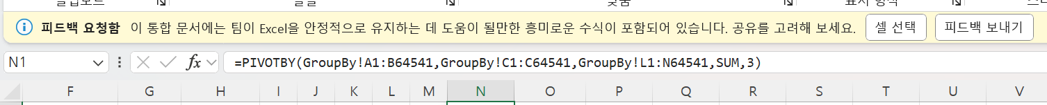 새로 검토중인 PIVOTBY 함수에 대한 검토를 하는 중인데, 파일을 열자 이런 알림이 떴습니다.