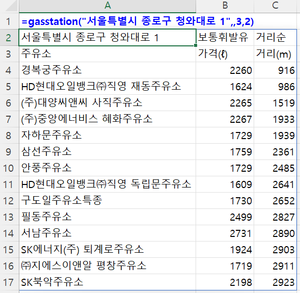도로명 주소를 사용하여 기본 옵션으로 조회 (보통휘발유, 반경 2km, 가격순 정렬)