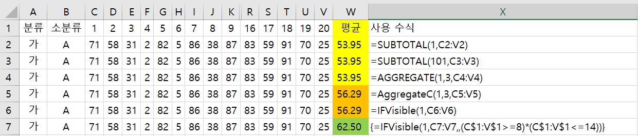 - AggregateC 함수는 감춰진 셀 계산 제외를 선택할 수 있으나 IFVisble은 선택없이 무조건 감춰진 셀을 제외