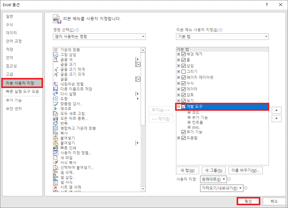 일반적으로 [개발도구] 탭은 보이지 않기 때문에 [파일 - 옵션 - 리본 사용자 지정] 선택