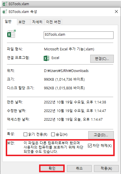 아래와 같이 차단해제를 체크하고 [적용]이나 [확인]