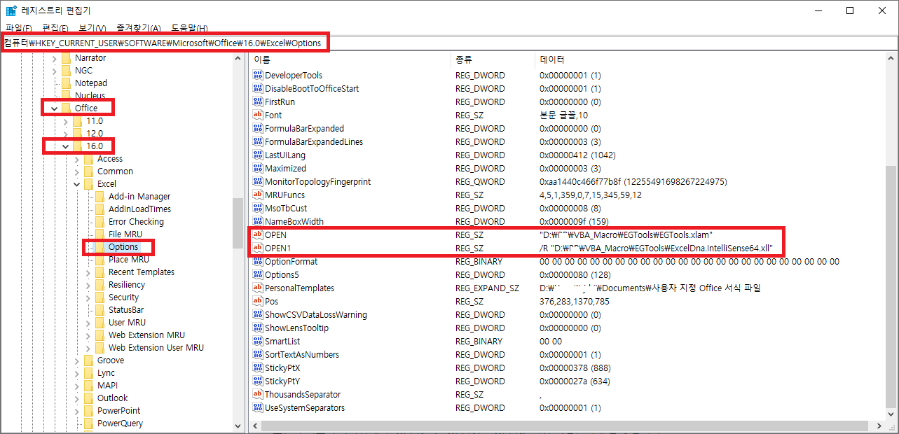 오른쪽 서브키 목록중에서 "OPEN" 및 "OPEN1", "OPEN2"처럼 나열된 부분을 찾습니다.