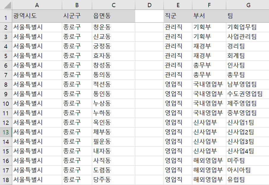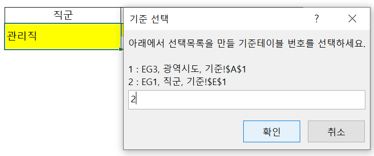 - 각각의 일람표 제목줄은 첫번째 셀 값이 달라야 함. (다단계선택을 구분하는 이름으로 사용함)