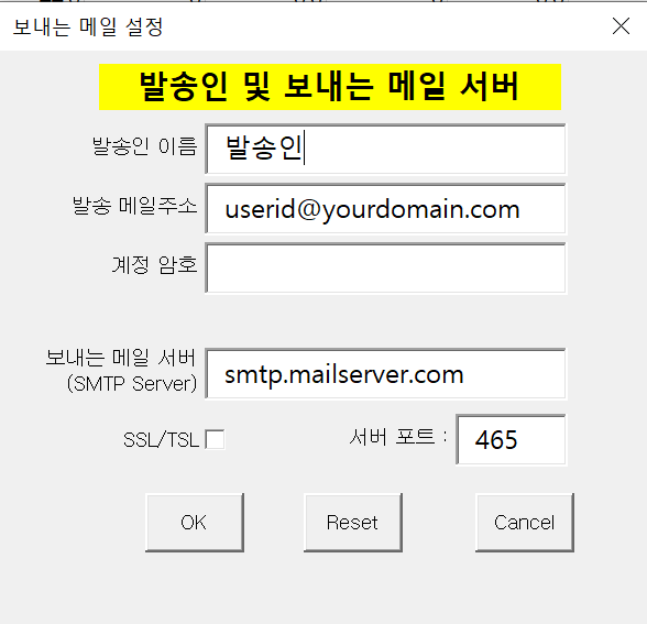 처음으로 메뉴를 실행할 때에 아래와 같이 보내는 메일 서버를 세팅해야 합니다.