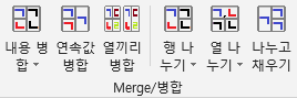 아래 3개의 메뉴는 셀들을 병합하면서 추가 기능을 합니다.