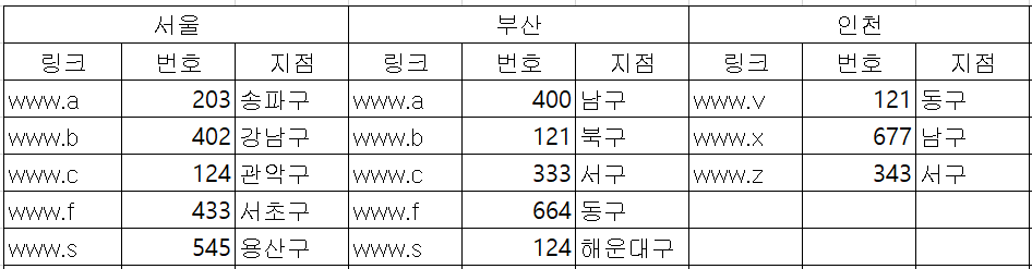 상기 그림처럼 열 머리게 자료가 세트 ( 링크/번호/지점 )로 되어 있는 경우