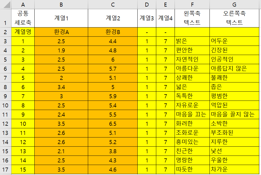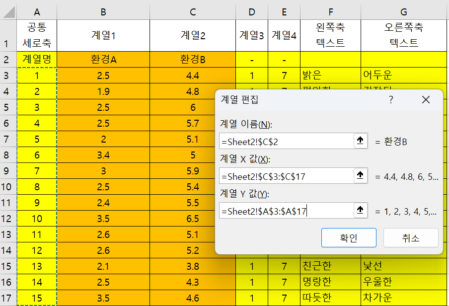 계열1/2는 원래 데이터, 계열3/4는 각 항목명을 나타내기 위한 값입니다.