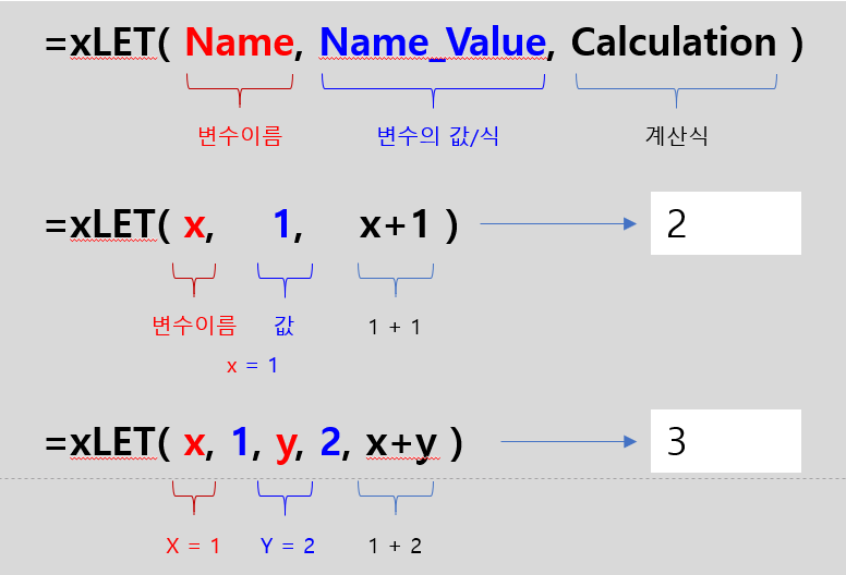 【 함수 요약 】 Excel 2021에 추가된 LET 함수를 구버전에서 사용할 수 있게 EGTools에서 지원하는 호환함수 계산 결과에 이름을 할당합니다. 이를 통해 수식 안에 중간 계산, 값을 저장하거나 이름을 정의할 수 있습니다. 이러한 이름은 LET 함수 범위 내에만 적용됩니다. 프로그래밍 시의 변수와 유사하게 LET 함수는 Excel의 기본 수식 구문을 통해 수행됩니다. 원본함수 설명 : https://support.microsoft.com/ko-kr/office/let-%ED%95%A8%EC%88%98-34842dd8-b92b-4d3f-b325-b8b8f9908999 원본 함수와 차이점 : Excel 2021의 원본함수 이름은 LET이나, EGTools에서는 xLET로 변경하여 지원함 【 적용 ..