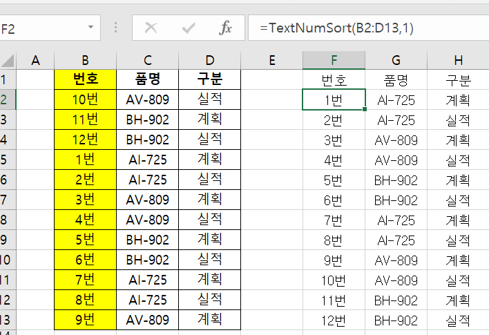 【 함수 요약 】 TextNumSort함수는 문자와 숫자가 섞여 있는 데이터를 정렬할 때, 숫자가 숫자로 정렬하도록 합니다. 문자를 무시하고 숫자로만 정렬하는 옵션을 추가하였습니다.(v3.8.7) 이 함수는 EGTools 추가기능에서 지원하는 함수입니다. 【 적용 버전 】 Windows용 : 모든버전 【 함수 구문 】 = TEXTNUMSORT ( DataRange , [ sort_index ] , [ sort_order ] , [ IgnoreText ] ) 【 함수 인수 】 인수명 옵션 기본값 설 명 DataRange 필수 없음 원본 Data의 범위 또는 Array sort_index 선택 1 정렬할 열번호, 생략하면 1 (첫번째 열) sort_order 선택 1 정렬방법, 기본값은 1 1 = 오름차순 ..