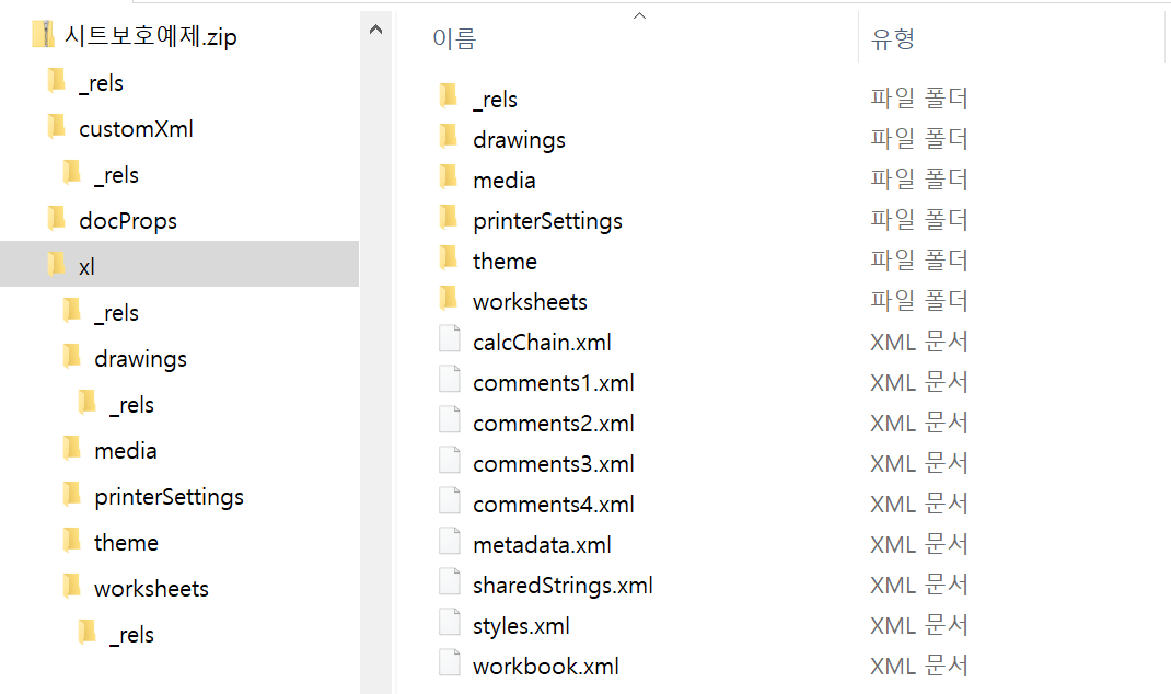 Excel의 보안은 취약하기 이를 데 없습니다. 예전에는 아주 간단한 문자열 대입하는 코드로도 시트보호 암호를 깨기도 했는데, 지금은 암호입력과 결과 반응 시간을 늘려서 해당 코드를 시간이 주구장창 길어져서 효과가 없는 것 같습니다. 그래서 다른 방법으로 해제하는 방법을 소개하면 아래와 같습니다. Excel 문서 파일은 Zip파일과 같은 형식으로 구성되어 있습니다. 확장자를 아래처럼 .zip으로 변경하고 파일탐색기에서 열어보면 아래와 같이 폴더 구조와 파일들을 볼 수 있습니다. 만약 열기 암호가 설정된 파일이라면 열기 암호를 해제한 후에 볼 수 있습니다. 주요 내용은 xl 폴더 안에 있으므로 xl폴더를 먼저 보면 아래와 같습니다. 여기에 보면 workbook.xml 이라는 파일이 있는데, 여기에 Work..